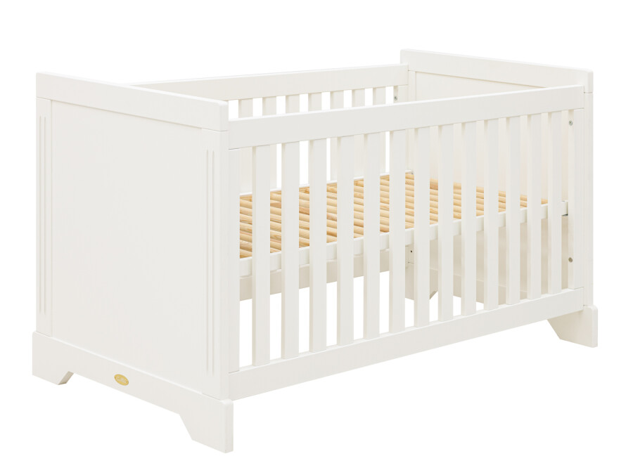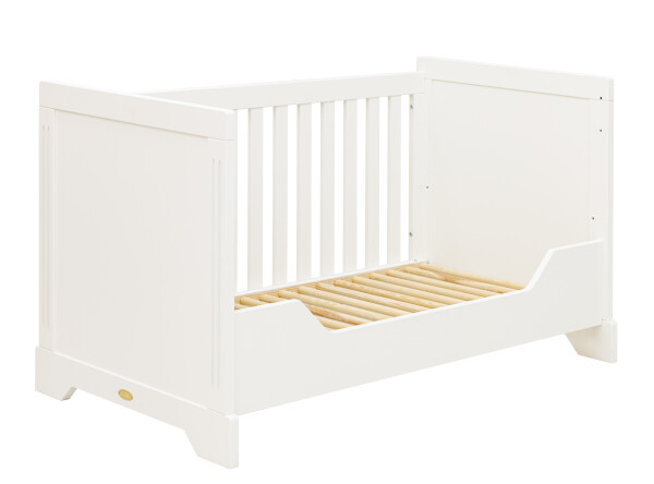 This baby bed (70 x 140 cm) Oliver by CocoMilou can be converted from a baby bed with slats, to a toddler bed bench so the little one can get in and out by himself and get used to this. Bed base, side rack and low side for the bed bench are included as standard. The spacious baby bed Oliver has a rustic look due to the subtle vertical grooves.