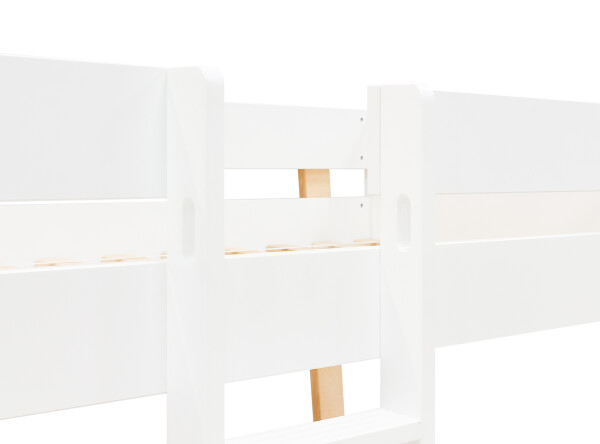 The Lisa bunk bed is made of strong beech wood and solid MDF. This wood is sourced from European forests. The beech stair treads have milled out grooves, which provide more grip. The handles in the stairs allow the child to climb up easily. Both beds have two support bars, giving the bunk bed extra stability.