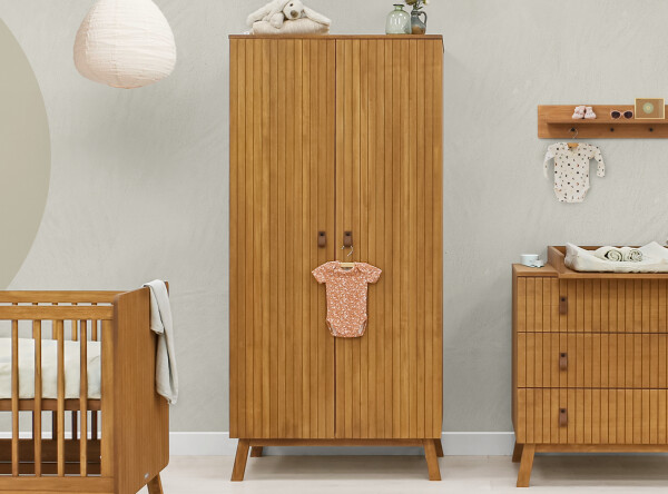 Class in a fine combination of warm wood, brown leather and subtle, vertical grooves.