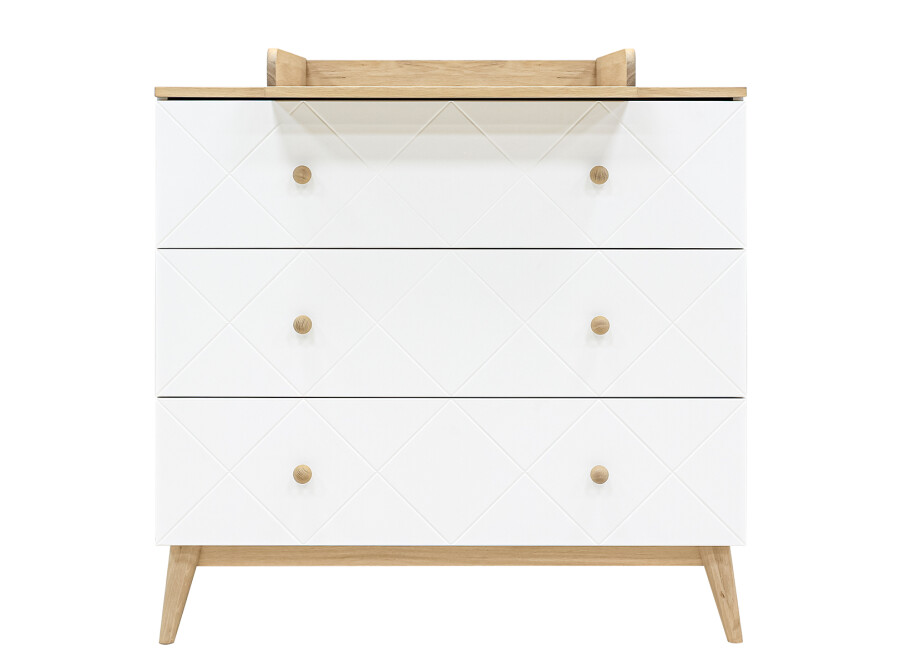 De commode Paris van Bopita is een echte blikvanger door zijn diagonale groeven en taps toelopende eiken poten. De laden zijn voorzien van een decoratief gefreesd ruitpatroon. De handgrepen zijn uitgevoerd in mat gelakt eiken. Het frame van deze commode is vervaardigd van solide MDF. Het hout van deze ladenkast is afkomstig uit Europese bossen.