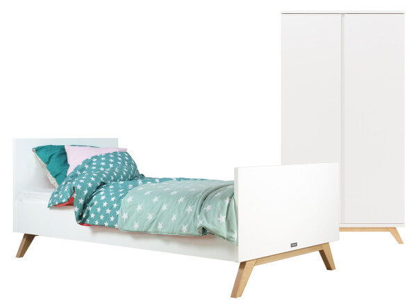 2-Delige kinderkamer van de serie Lynn bestaande uit een bed 90 x 200 cm en een kledingkast met twee deuren. Het bed en de kast staan op schuingeplaatste, beuken poten. Het bed is voorzien van een lattenbodem. De kledingkast heeft twee greeploze deuren en biedt veel opbergruimte voor alle spullen van je kind. Het bed en de kledingkast zijn afgewerkt met een lak op waterbasis. Niet alleen milieuvriendelijk, maar ook veilig voor kinderen. Het hout van deze kinderkamer set komt uit Europese beheerde bossen. Maak de kinderkamer compleet door een bijpassende nachtkast of bureau mee te bestellen.